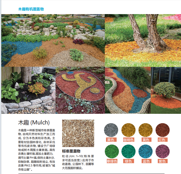 有機(jī)覆蓋物:是利用各種有機(jī)生物體材料,通過各種生產(chǎn)工藝,加工處理后鋪設(shè)于園藝植物或樹木周圍的土壤表面,起保持土壤水 分、吸附揚(yáng)塵、調(diào)節(jié)土壤溫度、增加土壤肥力、抑制雜草、促進(jìn)植栽生長、減少土壤侵蝕和緊實(shí)度以及裝飾美觀等等作用。(如下圖)