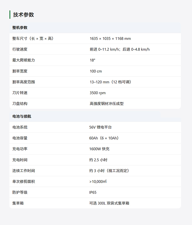 - ● 雙模式排草方案:側(cè)排草與 300L 集草箱任選,滿足不同場(chǎng)景需求。