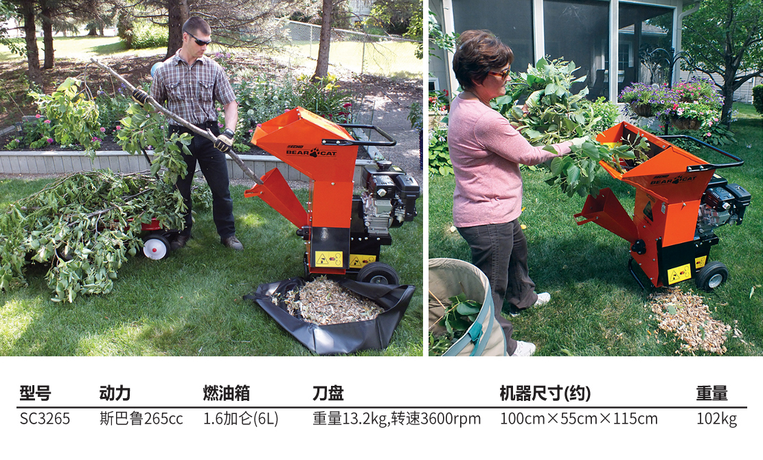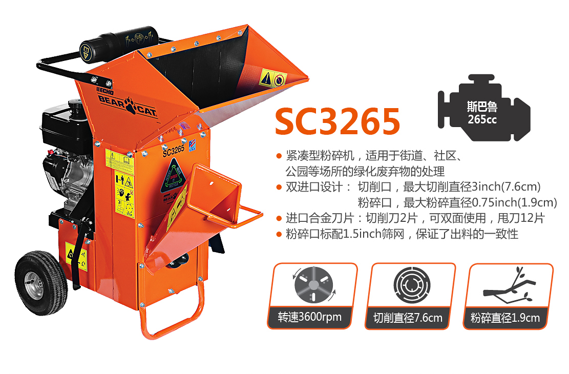 老熊(BEARCAT)品牌小型粉碎機(jī),配置斯巴魯265cc發(fā)動機(jī),擁有切削、粉碎兩個進(jìn)料口,以及可更換出料篩網(wǎng),最大可以切削3英寸(7.5cm)枝椏。體積小,操作靈活,適用公園、廣場、物業(yè)等多種區(qū)域。