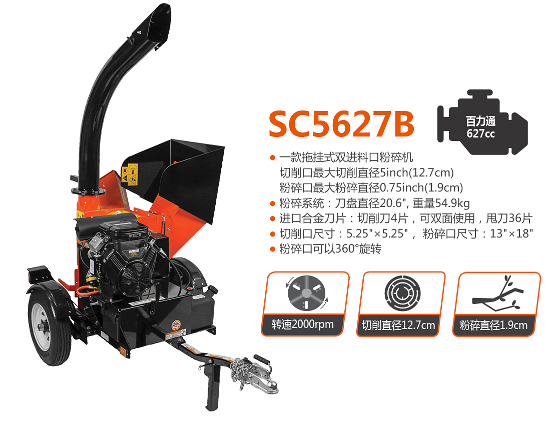 老熊(BEARCAT)品牌樹枝粉碎機(jī),配置斯巴魯720cc發(fā)動(dòng)機(jī)。擁有切削、粉碎兩個(gè)功能,最大可切削5英寸(12.7cm)枝椏,粉碎3/4英寸(2cm)枝椏。4片切削刀和36片粉碎刀保證了高效的處理效率。